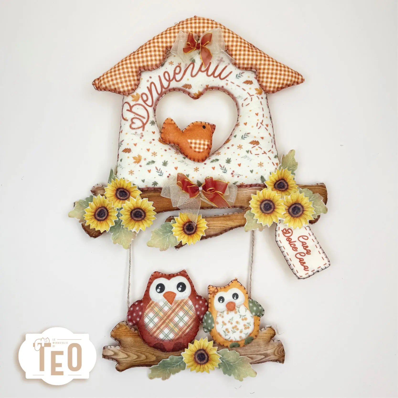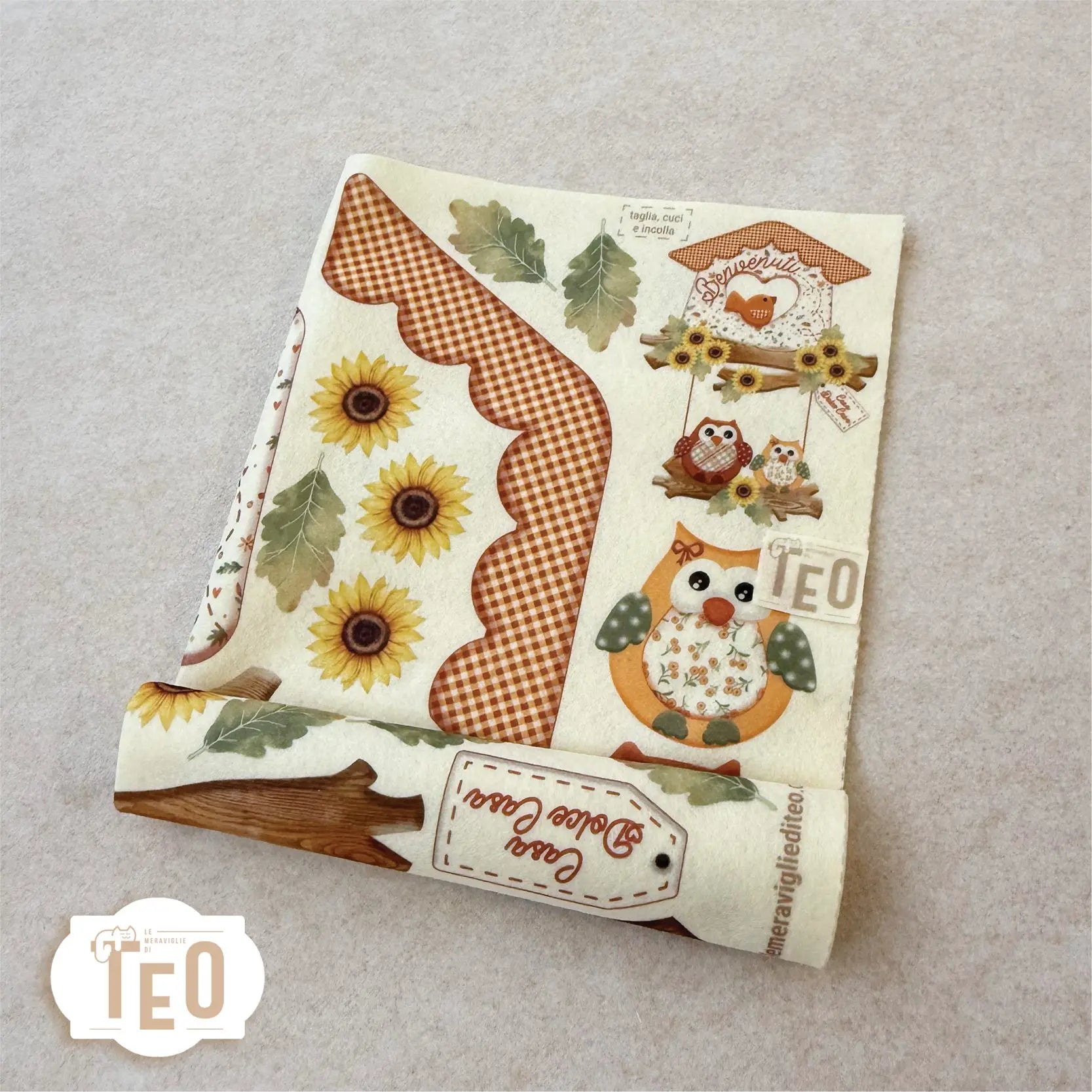 Un dolcissimo fuoriporta autunnale prende forma con il pannello “La Casetta Dell’Amore Autunno”: una casetta con tetto a quadretti, rami in legno, girasoli, foglie e due teneri gufetti innamorati. Ideale per dare un tocco accogliente e romantico alla casa durante i mesi più caldi dell’autunno, è perfetto da cucire o incollare con creatività..