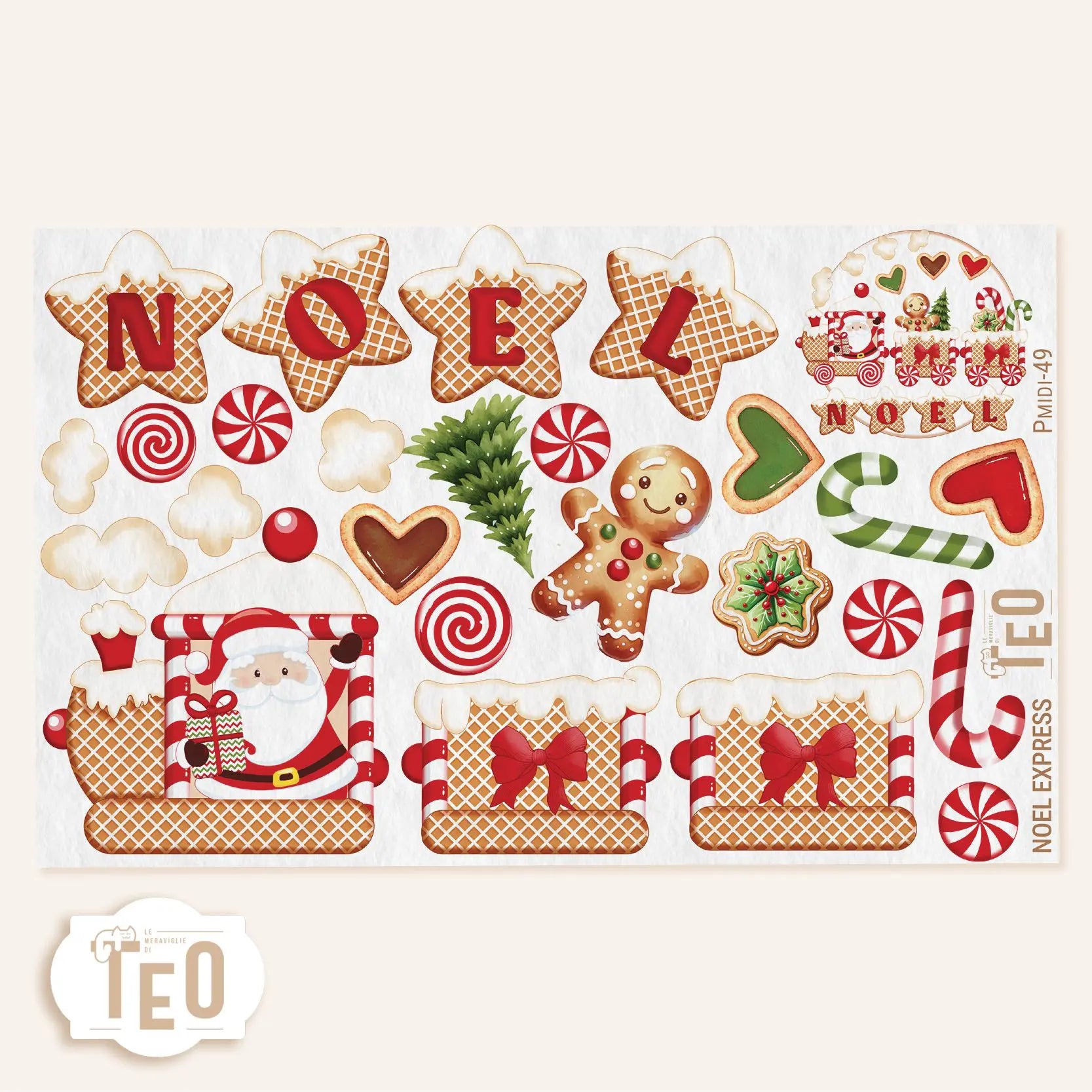 Questo pannello compatto racchiude tutto il necessario per creare una scenetta adorabile: trenino, biscotti di pan di zenzero, stelle con la scritta NOEL, caramelle, alberelli, bastoncini di zucchero e un simpatico Babbo Natale alla guida. Ideale per addobbi handmade, festoni, mini quadretti o packaging speciali.